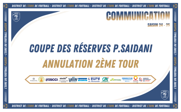 Le District de l’Eure de Football vous informe qu’en raison du nombres d’équipes, le second tour de la Coupe des réserves P.SAIDANI n’aura pas lieu.